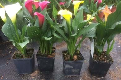 This year will be the third year that Flamingo Holland is trialing the Mini Callas! Our goal is to have 4 to 5 colors in Mini Calla varieties that compliment each other in height, finish time, etc. We are excited to let you know that we see great progress this third year. Our main variety is Sun Club. This yellow Mini Calla is producing well for tubers in the field and has great results and performance in a pot. With the other varieties we're trying to create the same great results of Sun Club.